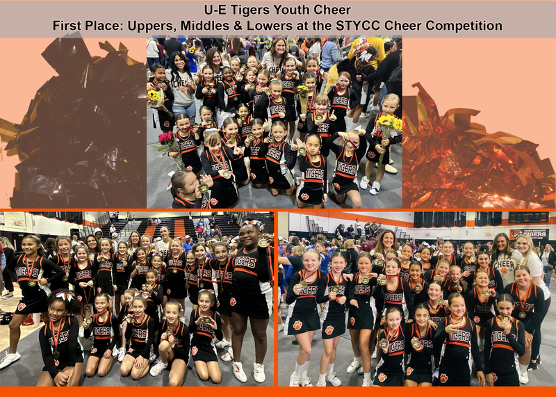 The U-E Tigers Youth Cheer teams competed in the STYCC Cheer Competition and swept all three levels, placing first in lowers, middles, and uppers!
