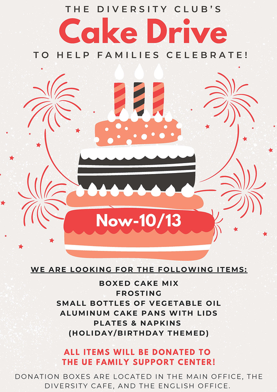 The UEHS Diversity Club is holding its first fundraiser of the school year: a cake drive. From now until October 13th, we are gathering supplies to put together cake party packs to donate to the Family Support Center. Donations can be dropped off at UEHS!