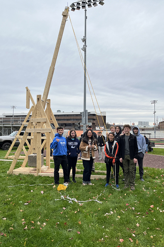 The project culminated in a lively competition where teams tested the accuracy and distance of their trebuchets' launches, showcasing the successful integration of STEM concepts in a creative and engaging manner. Through this project, students not only gained practical knowledge but also developed critical problem-solving and teamwork skills. Concepts taught with the trebuchet project include simple machines, mechanical advantage, projectile motion, acceleration, centripetal forces, gravitational forces, trigonometry, static equilibrium, beam and truss calculations, modules of elasticity, and calculating moments of inertia.
